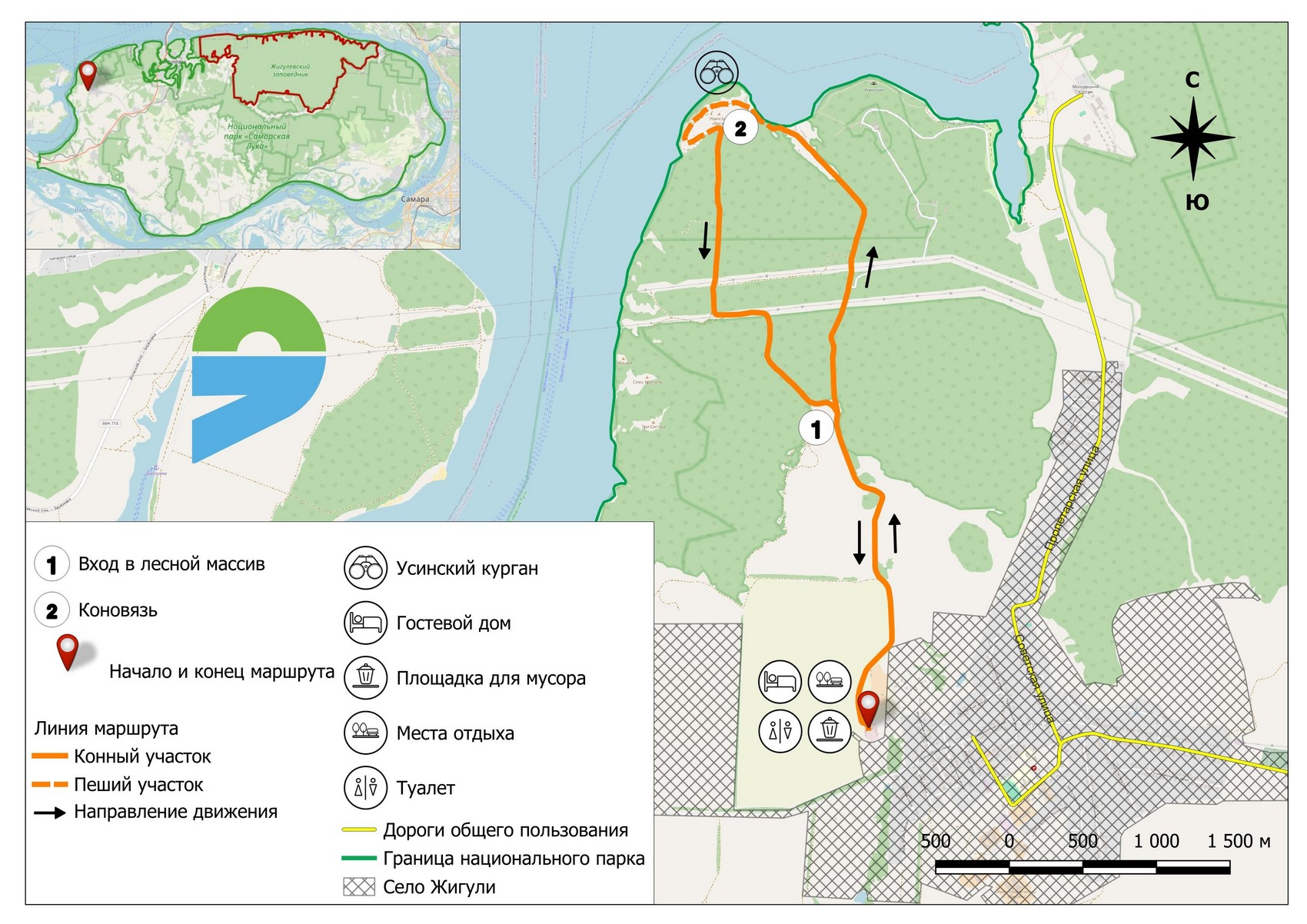 Целью конного маршрута протяженностью 10,6 км является посещение невысокой вершины в устье Усинского залива Жигулевского моря- Усинского кургана, который является памятником природы. На ,срезе пластов известняка возрастом 250 миллионов лет видны окаменелости древних морских беспозвоночных. С вершины кургана открывается красивый вид на Усинский залив, Волгу, Молодецкий курган.