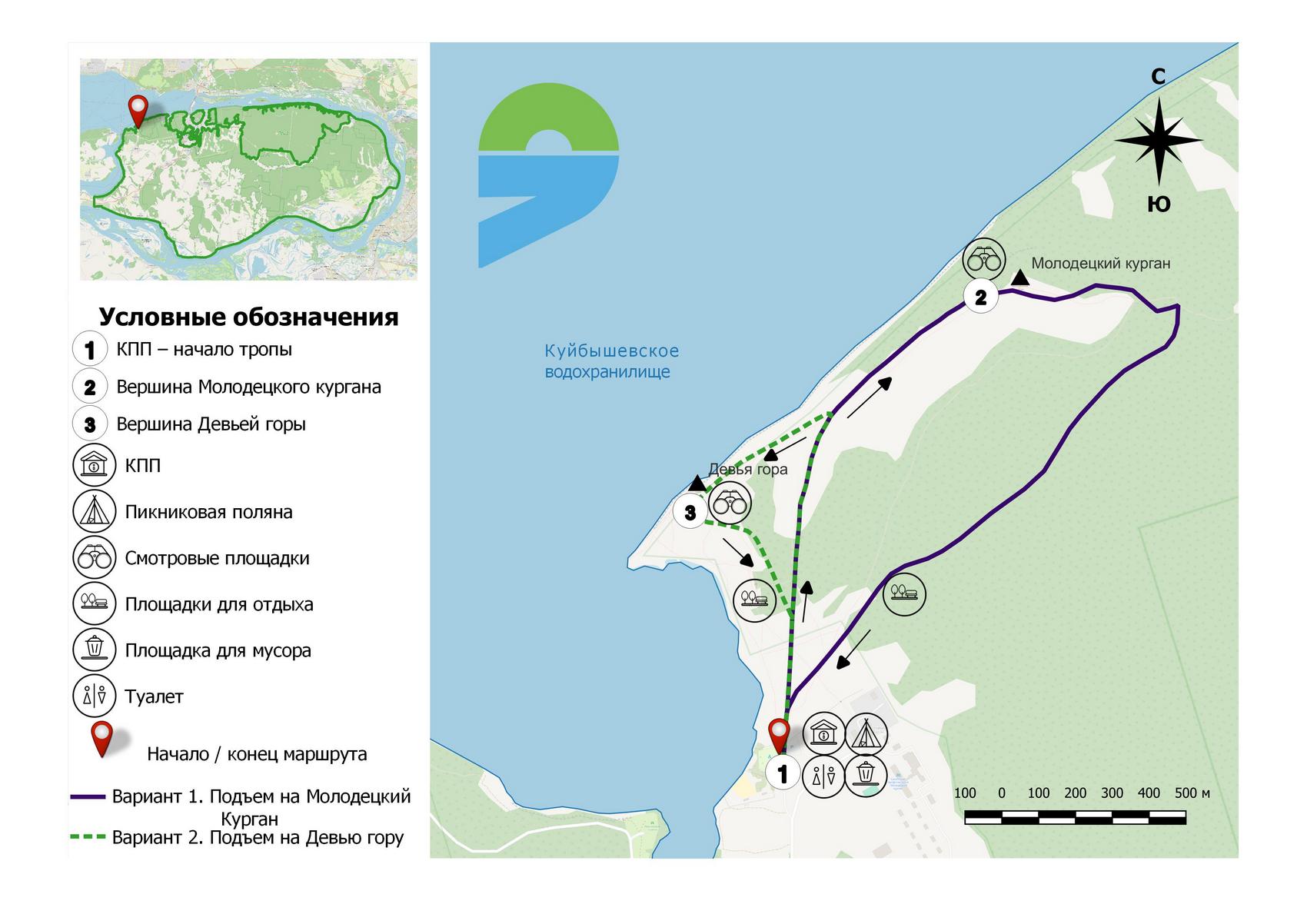 Маршрут протяженностью 5,7 км ведет на одну из лучших видовых точек Самарской Луки – вершину Молодецкого кургана. Это одна из доступных и красивых вершин в цепи Жигулевских гор. Существует 2 варианта прохождения тропы. Первый – с восхождением на вершину Молодецкого кургана для более подготовленных посетителей и второй, более простой, – на Девью гору. Тропа знакомит с флорой, фауной, историей и легендами Жигулей. С видовых точек открывается панорама Жигулевского моря и Жигулевских гор.